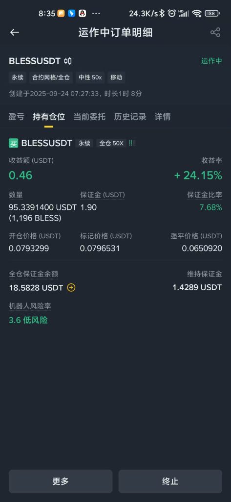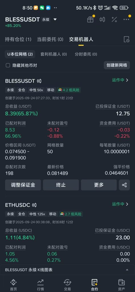 下面来提供几个,非常适合新手的交易模式:合约跟单 交易机器人 网格机器人。所谓交易,就是学习加模仿,我们可以去学习他们是如何交易的,然后再去模仿,如果学习能力强,觉悟好一点的就继续超越。我来推荐新手保命方法:降低杠杆,拒绝梭哈;选择主流币合约参与期货;不要高频买卖,格局一点,一个单子如果盈利了起码拿3天起步。下面给我自己的合约机器人独家参数:首先选择标——在首页合约——永续,筛选出今天涨幅榜前几名的,代表交易量很大,波动也很大,然后用布林线去判断当前行情如果是震荡的话,就开一个中性机器人,来回吃波动,如果币价一直处于来回震荡,那么可以实现躺赚钱=模式,不过提前设置止损。一旦脱离震荡,就要止盈了,有一天晚上开了一个震荡机器人,睡着了,半夜最高赚了70U,第二天醒来打回原形,后悔不已。参数低价=币价×0.9,高价=币价×1.23,然后杠杆拉满,50网格数,填写最低的USDT,一般只需要10U左右,就可以开出一个机器人了!